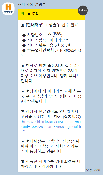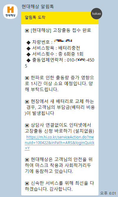 자동차 배터리 고장출동이 정상적으로 접수되면, 카톡으로 해당 메시지가 날아옵니다. 고장출동 서비스는 1년에 최대 6회까지 가능하니까 부담 없이 접수하셔도 됩니다.
