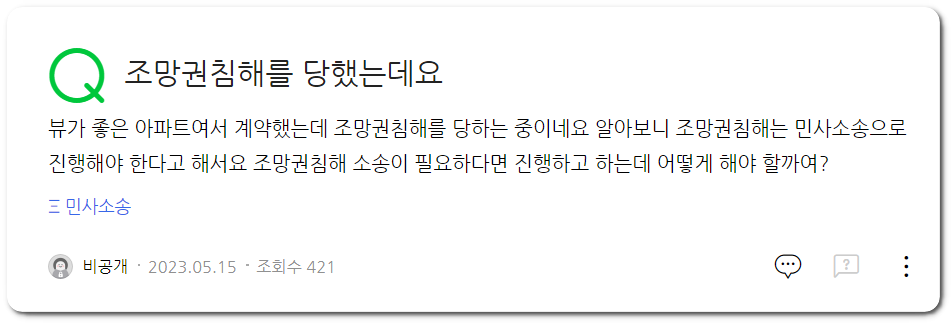 위에 지식인에 올라온 질문과도 같이 내가 만약 뷰가 좋은 아파트여서 계약을 했는데 조망권을 침해 당한다면 누구든 기분이 상하고 불쾌할 것이다. 실제로 부동산에서는 뷰값이라는 프리미엄이 존재할 정도로 조망권을 해당 장소의 가치를 높여주는 중요한 요소에 해당한다.