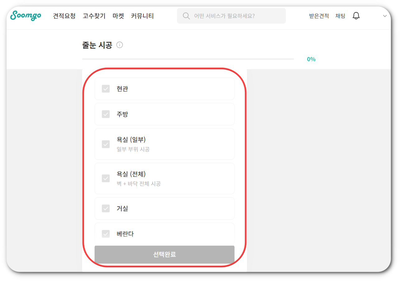 위와 같이 PC나 스마트폰으로 숨고 어플에 들어가서 줄눈시공 위치와 평수만 입력하고 기다리기만 하면 된다.